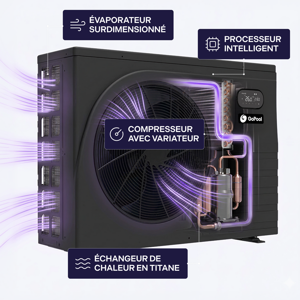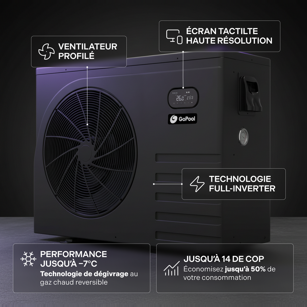 La GoPool InverONE 60 est une thermopompe Inverter compacte et efficace, idéale pour le chauffage des piscines creusées de moyenne taille. Sa technologie Inverter intelligente module automatiquement la vitesse du compresseur afin d’optimiser la performance, de réduire la consommation d’énergie et de maintenir une température d’eau constante.
